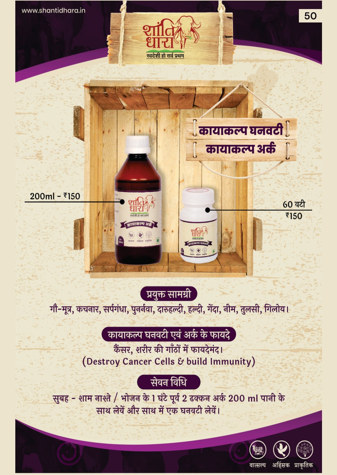 Main components - Cow urine, Kachnar, Sarpagandha, Punarnava, Daruhaldi, Turmeric, Marigold, Neem, Tulsi, Giloy.