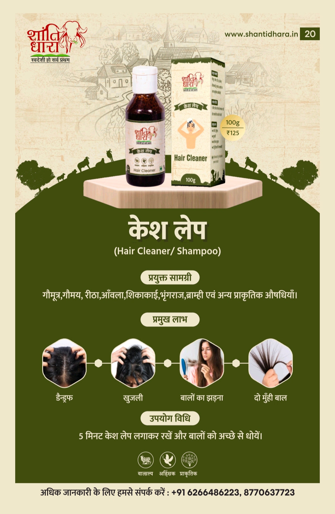 Main components - Cow urine, Gaumay, Reetha, Amla, Shikakai, Bhringraj, Brahmi and other natural medicines