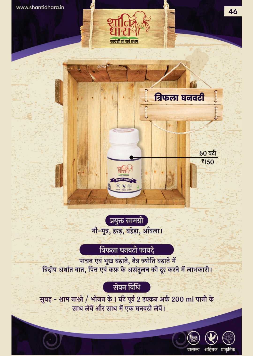 मुख्य घटक: गौ-मूत्र, हरड़, बहेड़ा, आँवला ।