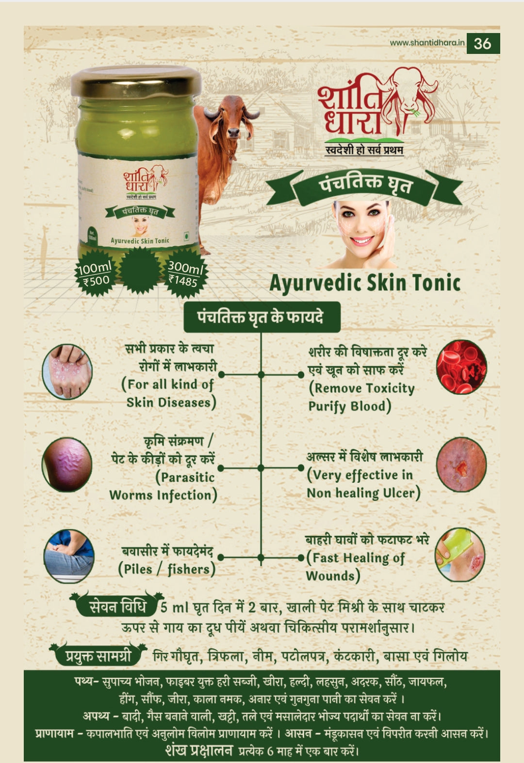 Main components - Gir Gau Ghrita, Neem bark, Patolpatra, Kateri Panchang, Vasa Panchang, Giloy, Harad, Baheda, Amla.